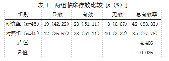 2.1两组临床疗效比较研究组治疗总有效率为93.33%(42/45),高于对照组的77.78%(35/45),差异有统计学意义(P<0.05)。见表1。