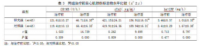 2.3两组治疗前后心肌损伤标志物水平比较治疗前,两组CK-MB、cTnI、hs-CRP水平比较,差异均无统计学意义(P>0.05);治疗后,两组CK-MB、cTnI、hs-CRP水平均低于治疗前,且研究组低于对照组,差异有统计学意义(P<0.05)。见表3。