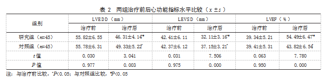 2.2两组治疗前后心功能指标水平比较治疗前,两组LVEDD、LVESD、LVEF水平比较,差异均无统计学意义(P>0.05);治疗后,两组LVEF水平均高于治疗前,且研究组高于对照组,两组LVEDD、LVESD水平均低于治疗前,且研究组低于对照组,差异有统计学意义(P<0.05)。见表2。