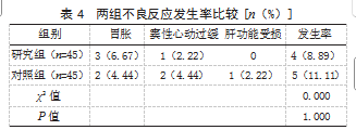 2.4两组不良反应发生率比较研究组不良反应发生率为8.89%(4/45),对照组不良反应发生率为11.11%(5/45),两组不良反应发生率比较,差异无统计学意义(P>0.05)。见表4。