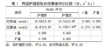 2.1两组护理前后负性情绪评分比较护理前,两组HAMA评分比较,差异无统计学意义(P>0.05);护理后,两组HAMA评分均低于护理前,且观察组低于对照组,差异有统计学意义(P<0.05)。见表1。