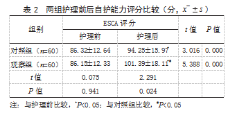 2.2两组护理前后自护能力评分比较护理前,两组ESCA评分比较,差异无统计学意义(P>0.05);护理后,两组ESCA评分均高于护理前,且观察组高于对照组,差异有统计学意义(P<0.05)。见表2。