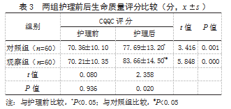 2.3两组护理前后生命质量评分比较护理前,两组CQQC评分比较,差异无统计学意义(P>0.05);护理后,两组CQQC评分均高于护理前,且观察组高于对照组,差异有统计学意义(P<0.05)。见表3。