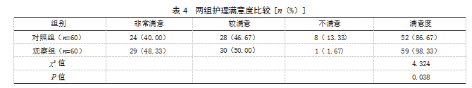 2.4两组护理满意度比较观察组护理满意度为98.33%,高于对照组的86.67%,差异有统计学意义(P<0.05)。见表4。