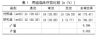 2.1两组临床疗效比较研究组治疗总有效率为96.23%(51/53),高于对照组的75.47%(40/53),差异有统计学意义(P<0.05)。见表1。