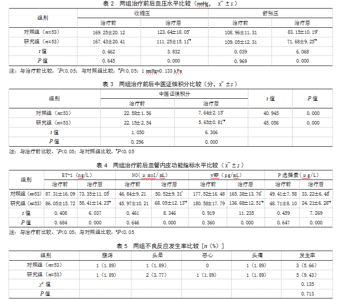 1.1一般资料回顾性分析2021年1月至2023年1月本院收治的106例老年高血压患者的临床资料。纳入标准:西医符合高血压诊断标准[3];中医符合肝阳上亢型诊断标准[4],主症为头晕头痛、面红目赤、烦躁易怒、耳鸣如潮、失眠多梦,次症为口苦咽干、头重脚轻、便秘、尿黄,舌质红,苔薄黄,脉弦数;年龄>60岁。排除标准:合并造血系统疾病;合并精神疾病;合并心、肺、肝、肾功能障碍;对本研究所用药物过敏或存在禁忌证。患者对本研究内容了解并自愿签署知情同意书。根据治疗方法不同将其分为对照组和研究组各53例。对照组男30例,女23例;年龄65~82岁,平均(72.45±3.85)岁;病程2~6个月,平均(4.21±1.50)个月;高血压分级:1级21例,2级22例,3级10例。研究组男31例,女22例;年龄65~84岁,平均(72.66±3.79)岁;病程1~7个月,平均(4.28±1.48)个月;高血压分级:1级22例,2级23例,3级8例。两组一般资料比较,差异无统计学意义(P>0.05),有可比性。