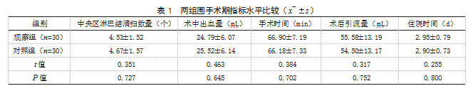 2.1两组围手术期指标水平比较两组中央区淋巴结清扫数量、术中出血量、手术时间、术后引流量、住院时间比较,差异均无统计学意义(P>0.05)。见表1。