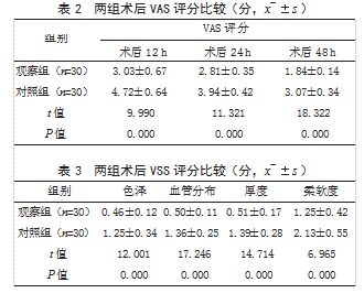 2.3两组术后切口美观度评分比较观察组色泽、血管分布、厚度、柔软度等VSS评分均低于对照组,差异有统计学意义(P<0.05)。见表3。