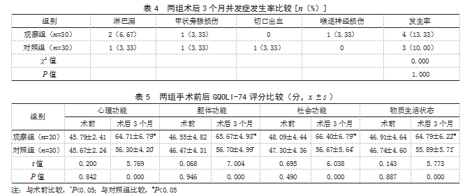 1.2方法两组均行单侧甲状腺癌根治术,且由同一个医疗团队操作。