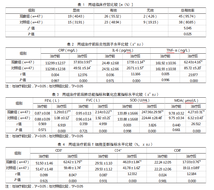观察组在对照组基础上联合血必净注射液(天津红日药业股份有限公司,国药准字Z20040033,10 mL)治疗,将50 mL本品溶于100 mL 0.9%氯化钠注射液中静脉滴注,2次/d,连续治疗10 d。1.3观察指标(1)比较两组临床疗效。显效:患者咳嗽、发热、呼吸困难等症状基本消失,氧合指数(OI)水平提高≥90%;有效:症状显著好转,40%≤OI水平提高<90%;无效:症状轻微好转,OI水平提高<40%。总有效率=(显效+有效)例数/总例数×100%。(2)比较两组治疗前后炎性因子水平。采用酶联免疫吸附法测定血清C反应蛋白(CRP)、肿瘤坏死因子-α(TNF-α)和白细胞介素-6(IL-6)水平。(3)比较两组治疗前后肺功能指标和氧化应激指标水平。采用肺功能测试仪(秦皇岛市惠斯安普医学系统股份有限公司,冀械注准20242070357,PF-100型)检测用力肺活量(FVC)、第1秒用力呼气容积(FEV1)水平;采用硫代巴比妥酸化学比色法测定血清丙二醛(MDA)水平,黄嘌呤氧化酶法检测超氧化物歧化酶(SOD)水平。(4)比较两组治疗前后T细胞亚群指标水平。采用流式细胞分析仪(无锡厦泰生物科技有限公司,苏械注准20212220585,NL-CLC B14型)检测CD3+、CD4+和CD8+水平。(5)比较两组治疗前后动脉血气分析指标水平。采用血气分析仪测定动脉血氧饱和度(SaO2)、动脉血氧分压(PaO2)、动脉血二氧化碳分压(PaCO2)、吸入氧浓度(FiO2),并计算OI。(6)比较两组不良反应发生率。