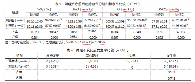 2.5两组治疗前后动脉血气分析指标水平比较治疗前,两组SaO2、PaO2、OI、PaCO2水平比较,差异均无统计学意义(P>0.05);治疗后,两组SaO2、PaO2、OI水平均高于治疗前,且观察组高于对照组,两组PaCO2水平均低于治疗前,且观察组低于对照组,差异有统计学意义(P<0.05)。见表5。
