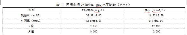 2.1两组血清25(OH)D、Hcy水平比较观察组血清25(OH)D水平低于对照组,Hcy水平高于对照组,差异均有统计学意义(P<0.05)。见表1。