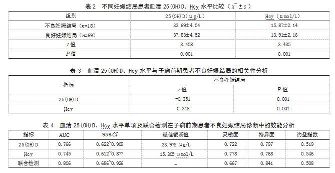 1.3观察指标(1)比较两组血清25(OH)D、Hcy水平。(2)比较不同妊娠结局患者血清25(OH)D、Hcy水平。(3)分析血清25(OH)D、Hcy水平与子痫前期患者不良妊娠结局的相关性。(4)分析血清25(OH)D、Hcy水平单项及联合检测在子痫前期患者不良妊娠结局诊断中的效能。