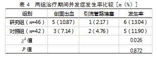 2.4两组治疗期间并发症发生率比较治疗期间,研究组并发症发生率为13.04%,对照组并发症发生率为11.90%。两组并发症发生率比较,差异无统计学意义(P>0.05)。见表4。