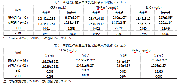 2.3两组治疗前后血清生长因子水平比较治疗前,两组血清VEGF、bFGF等生长因子水平比较,差异均无统计学意义(P>0.05);治疗后,两组血清VEGF、bFGF等生长因子水平高于治疗前,且研究组高于对照组,差异均有统计学意义(P<0.05)。见表3。