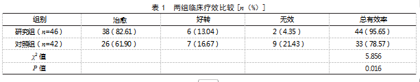 2.1两组临床疗效比较研究组治疗总有效率为95.65%,明显高于对照组的78.57%,差异有统计学意义(P<0.05)。见表1。