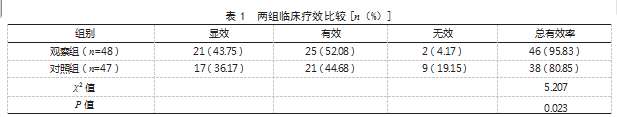 2.1两组临床疗效比较观察组治疗总有效率为95.83%(46/48),高于对照组的80.85%(38/47),差异有统计学意义(P<0.05)。见表1。
