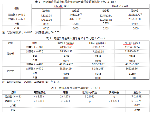 2.2两组治疗前后抑郁程度和病情严重程度评分比较治疗前,两组CGI-S-BP、HAMD-17评分比较,差异均无统计学意义(P>0.05);治疗后,两组CGI-S-BP、HAMD-17评分均低于治疗前,且观察组低于对照组,差异有统计学意义(P<0.05)。见表2。