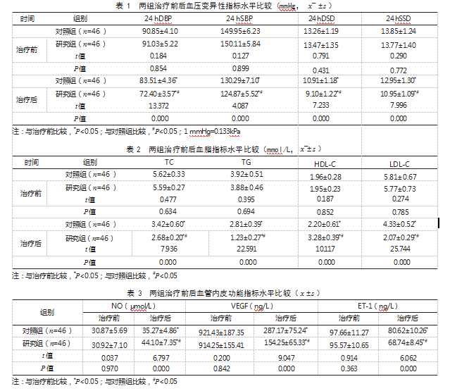 2.1两组治疗前后血压变异性指标水平比较治疗前,两组24 hDBP、24 hSBP、24 hDSD、24 hSSD水平比较,差异均无统计学意义(P>0.05);治疗后,两组24 hDBP、24 hSBP、24 hDSD、24 hSSD水平均低于治疗前,且研究组低于对照组,差异有统计学意义(P<0.05)。见表1。