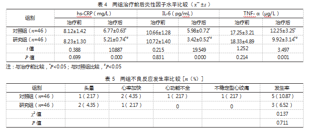 2.4两组治疗前后炎性因子水平比较治疗前,两组hs-CRP、IL-6、TNF-α水平比较,差异均无统计学意义(P>0.05);治疗后,两组hs-CRP、IL-6、TNF-α水平均低于治疗前,且研究组低于对照组,差异有统计学意义(P<0.05)。见表4。