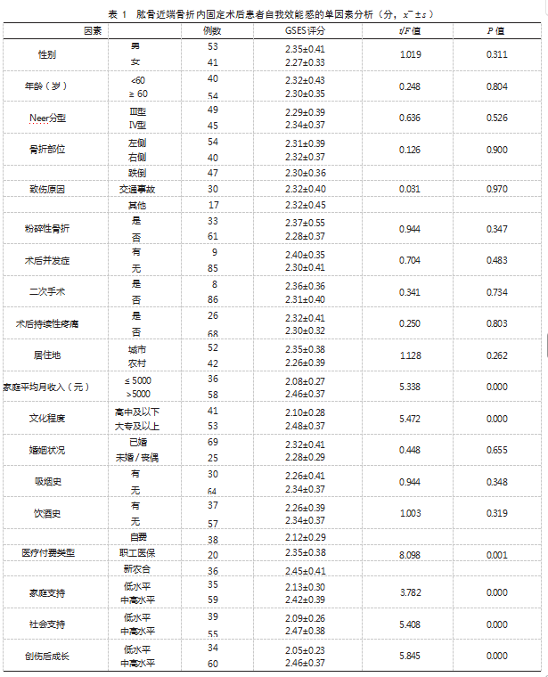 2.1肱骨近端骨折内固定术后患者自我效能感评分94例肱骨近端骨折患者术后GSES评分为1~3分,平均(2.31±0.38)分,自我效能感处于中等水平。