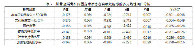 2.2肱骨近端骨折内固定术后患者自我效能感的单因素分析不同性别、年龄、Neer分型、骨折部位、致伤原因、粉碎性骨折、术后并发症、二次手术、术后持续性疼痛、居住地、婚姻状况、吸烟史、饮酒史等肱骨近端骨折内固定术后患者的GSES评分比较,差异均无统计学意义(P>0.05);家庭平均月收入≤5000元、文化程度高中及以下、医疗自费、家庭支持低水平、社会支持低水平、创伤后成长低水平等肱骨近端骨折内固定术后患者的GSES评分均较低,差异有统计学意义(P<0.05)。见表1。