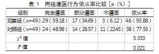 2.1两组遵医行为依从率比较观察组遵医行为依从率为93.88%(46/49),高于对照组的77.55%(38/49),差异有统计学意义(P<0.05)。见表1。