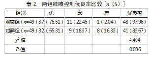 2.2两组哮喘控制优良率比较观察组哮喘控制优良率为97.96%(48/49),高于对照组的83.67%(41/49),差异有统计学意义(P<0.05)。见表2。