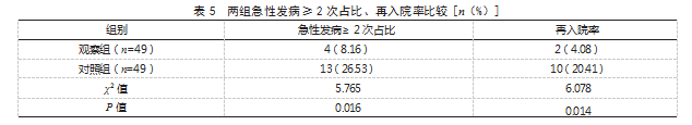2.5两组急性发病≥2次占比、再入院率比较观察组急性发病≥2次占比、再入院率均低于对照组,差异有统计学意义(P<0.05)。见表5。