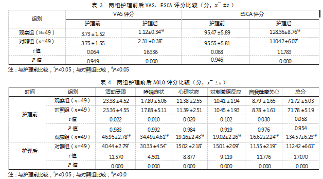 2.3两组护理前后咳喘程度、自护能力评分比较护理前,两组VAS、ESCA评分比较,差异均无统计学意义(P>0.05);护理后,两组VAS评分均低于护理前,且观察组低于对照组,两组ESCA评分均高于护理前,且观察组高于对照组,差异有统计学意义(P<0.05)。见表3。