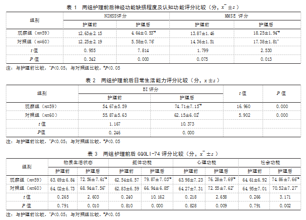 2.1两组护理前后神经功能缺损程度及认知功能评分比较护理前,两组NIHSS、MMSE评分比较,差异均无统计学意义(P>0.05);护理后,两组NIHSS评分均低于护理前,且观察组低于对照组,两组MMSE评分均高于护理前,且观察组高于对照组,差异有统计学意义(P<0.05)。见表1。