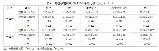 2.4两组护理前后心理弹性评分比较护理前,两组精神、控制、接受变化、忍受消极情感、能力评分比较,差异均无统计学意义(P>0.05);护理后,两组精神、控制、接受变化、忍受消极情感、能力评分均高于护理前,且观察组高于对照组,差异有统计学意义(P<0.05)。见表4。