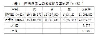 2.1两组疾病知识掌握优良率比较观察组疾病知识掌握优良率为96.87%,高于对照组的72.73%,差异有统计学意义(P<0.05)。见表1。