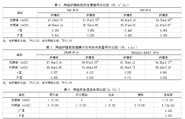 2.3两组护理前后健康行为和生命质量评分比较护理前,两组SRAHP、WHOQOL-BREF评分比较,差异均无统计学意义(P>0.05);护理后,两组SRAHP、WHOQOL-BREF评分均高于护理前,且观察组高于对照组,差异有统计学意义(P<0.05)。见表3。