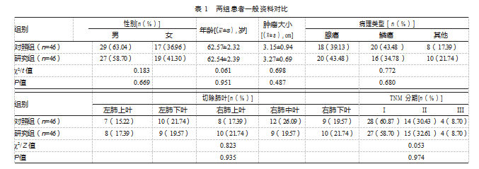 回顾性选取2021年10月—2024年10月在广东医科大学附属第二医院和广东医科大学附属医院接受肺叶切除术的92例患者的临床资料,根据手术方式不同分为对照组和研究组,对照组患者接受传统胸腔镜肺叶切除术,研究组患者接受机器人辅助胸腔镜肺叶切除术。对照组年龄58~67岁;肿瘤直径1.0~5.0 cm。研究组年龄57~66岁;肿瘤直径1.8~4.8 cm。两组患者一般资料对比,差异均无统计学意义(P均>0.05),具有可比性。见表1。本研究已通过本院伦理委员会审核(PJKT2025-003)。入院时,患者知情同意并签署知情同意书。