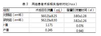 研究组患者术后引流量和留置引流管时间对比,差异均无统计学意义(P均>0.05)。见表3。
