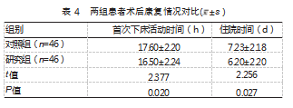 研究组患者首次下床活动时间、住院时间短于对照组,差异均有统计学意义(t=2.377,2.256;P均<0.05)。见表4。