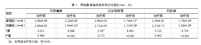 治疗后两组症状积分均下降,观察组外阴瘙痒、分泌物异常、灼热感症状积分均低于参照组,差异均有统计学意义(P均<0.05)。见表1。