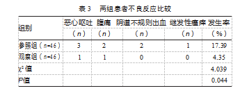 ③评估两组不良反应,考虑不良反应存在迟发性,持续观察至停药后2周,记录两组患者恶心呕吐、腹痛、阴道不规则出血、继发性瘙痒的发生率。