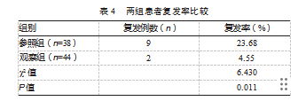随访1年,观察组复发率低于参照组,差异有统计学意义(P<0.05)。见表4。