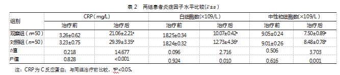 ②两组炎症因子水平比较:患者空腹时取3 mL外围静脉血进行分析,以测量血清中C反应蛋白(C-reactive protein,CRP)水平、白细胞数、中性粒细胞数。