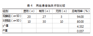 观察组总有效率高于对照组,差异有统计学意义(P<0.05)。见表4。