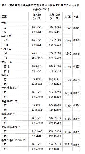 2.1鼓膜穿刺术结合鼻喷雾剂治疗分泌性中耳炎患者复发的单因素分析