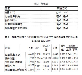 2.2鼓膜穿刺术结合鼻喷雾剂治疗分泌性中耳炎患者复发的多因素Logistic回归分析