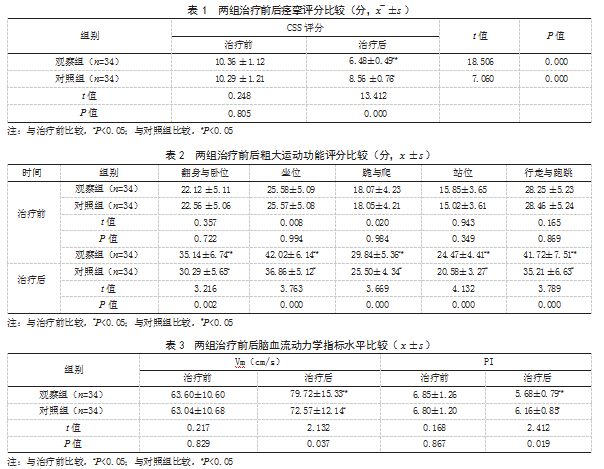 1.3观察指标(1)比较两组治疗前后痉挛评分。治疗前和治疗3个月后,采用综合痉挛评分量表(CSS)评估,总分1~16分,评分越高表明痉挛越严重。(2)比较两组治疗前后粗大运动功能评分。治疗前和治疗3个月后,采用粗大运动功能评估量表88项(GMFM-88)评估,包括行走与跑跳(0~72分)、翻身与卧位(0~51分)、跪与爬(0~42分)、站位(0~39分)、坐位(0~60分)5个能区,评分越高表明粗大运动功能越好。(3)比较两组治疗前后脑血流动力学指标水平。治疗前和治疗3个月后,采用经颅多普勒超声检测脑动脉平均血流速度(Vm)、阻力指数(PI)。(4)比较两组治疗前后智力发育评分。治疗前和治疗3个月后,采用韦氏儿童智力测评量表(WLSC-CR)评估,<70分表明智力发育低于正常水平,≥70分表明智力发育正常,且评分越高表明智力发育越好。