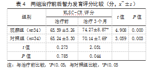 2.4两组治疗前后智力发育评分比较治疗前,两组WLSC-CR评分比较,差异无统计学意义(P>0.05);治疗后,两组WLSC-CR评分均高于治疗前,且观察组高于对照组,差异有统计学意义(P<0.05)。见表4。