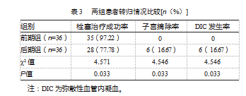 前期组栓塞治疗成功率为97.22%,高于后期组的77.78%,前期组子宫摘除率、DIC发生率均低于后期组,差异均有统计学意义(P均<0.05)。见表3。