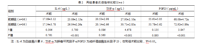术后,前期组IL-6、TNF-α、FGF23水平均低于后期组,差异均有统计学意义(P均<0.05)。见表2。