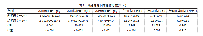 前期组术中出血量、术中输血量、术后出血量均少于后期组,前期组手术时间、出院时间均短于后期组,差异均有统计学意义(P均<0.05)。两组经期正常时间比较,差异无统计学意义(P>0.05)。见表1。