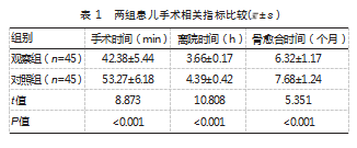 观察组手术时间、离院时间及骨愈合时间均短于对照组,差异均有统计学意义(P均<0.05)。见表1。